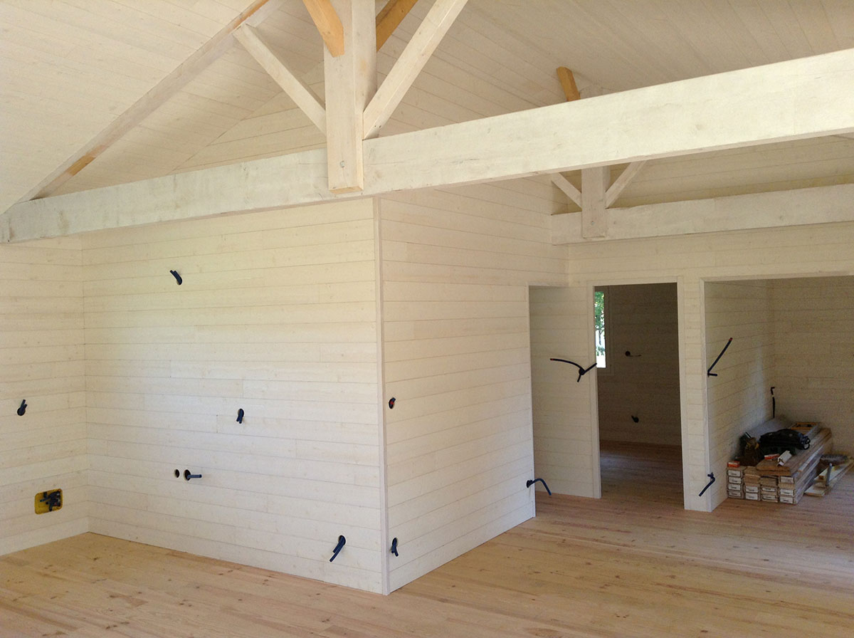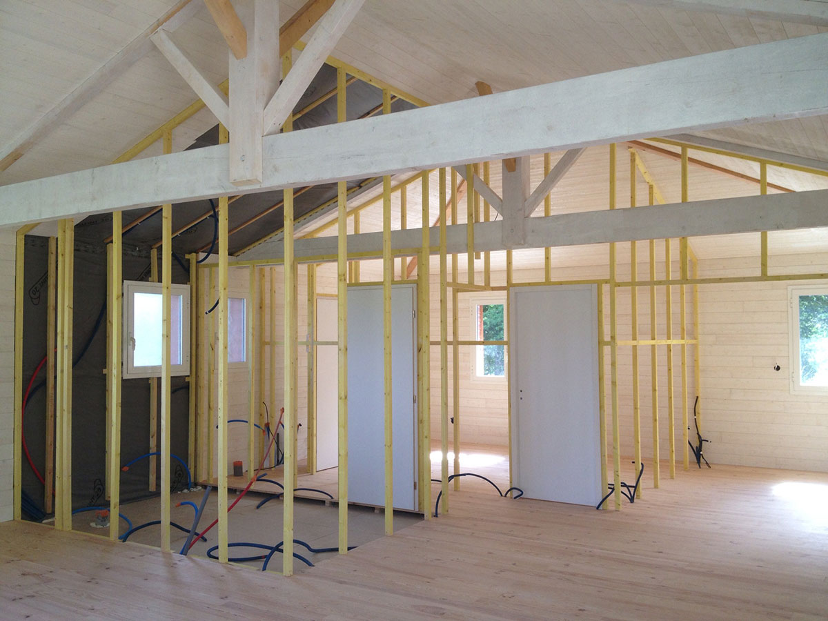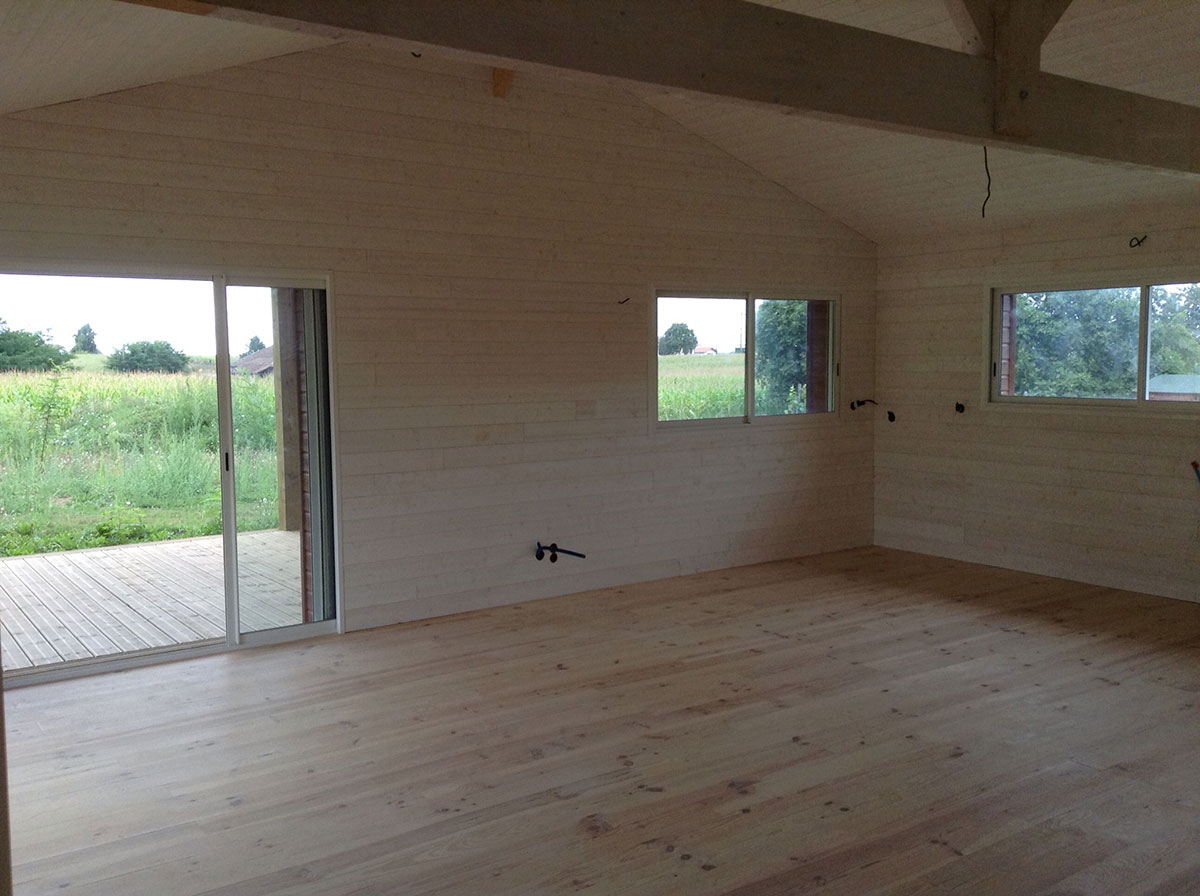 La réalisation de cette maison en ossature bois incluait l’ensemble de l’aménagement intérieur et extérieur, avec des plafonds sous rampants dans toutes les pièces.