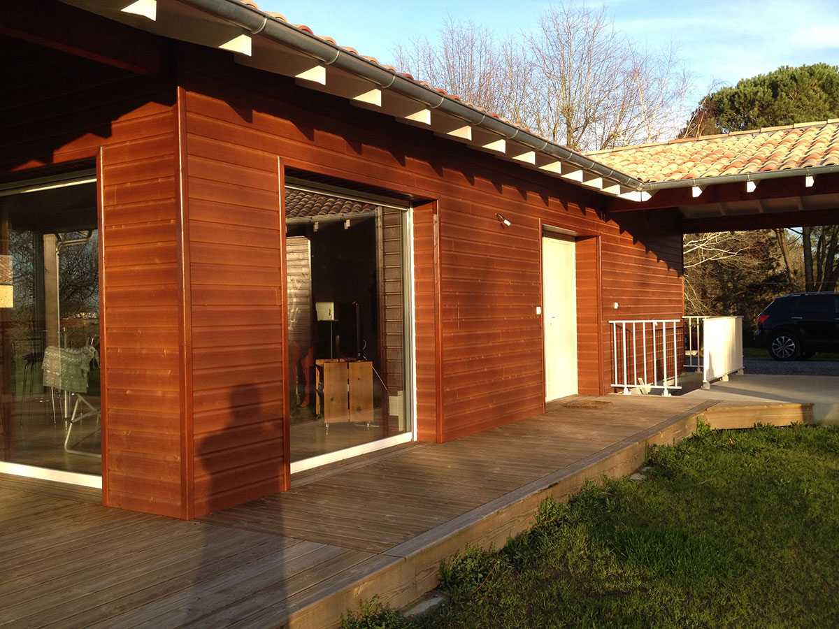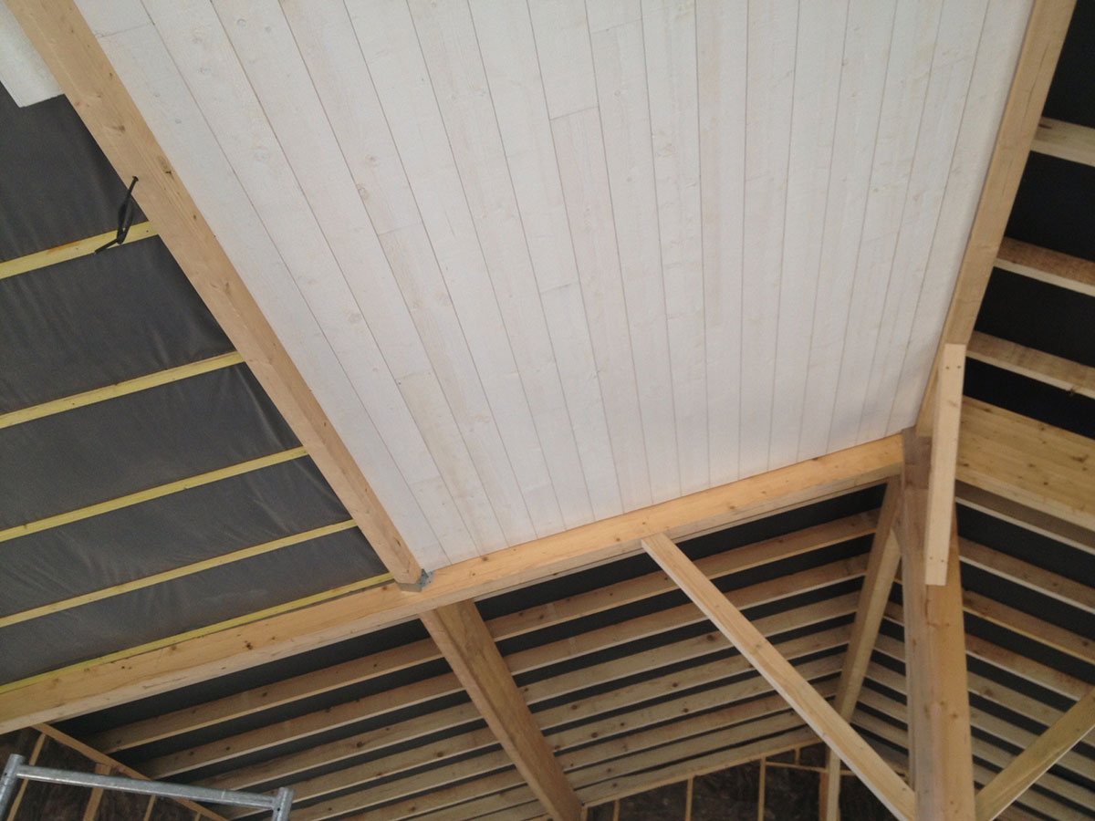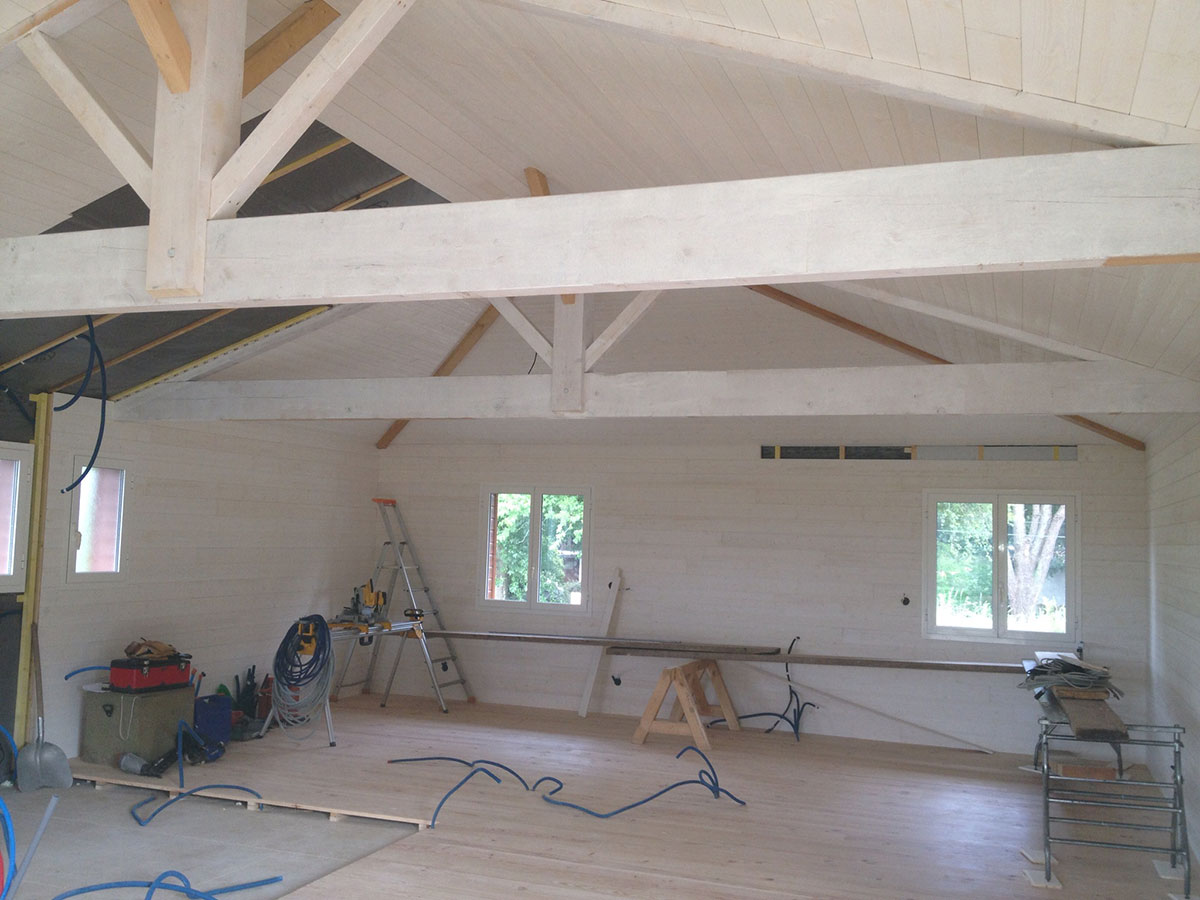 La réalisation de cette maison en ossature bois incluait l’ensemble de l’aménagement intérieur et extérieur, avec des plafonds sous rampants dans toutes les pièces.