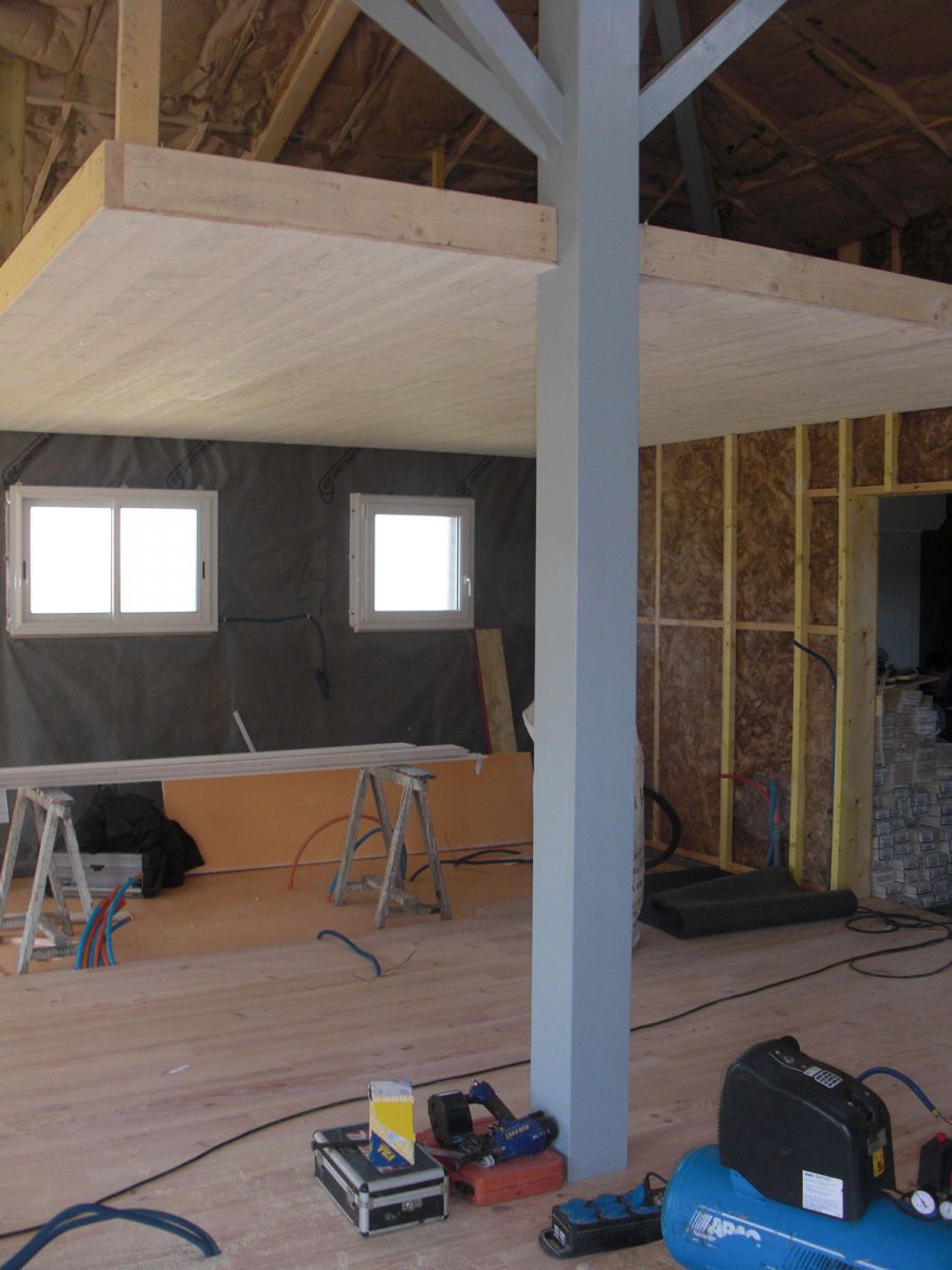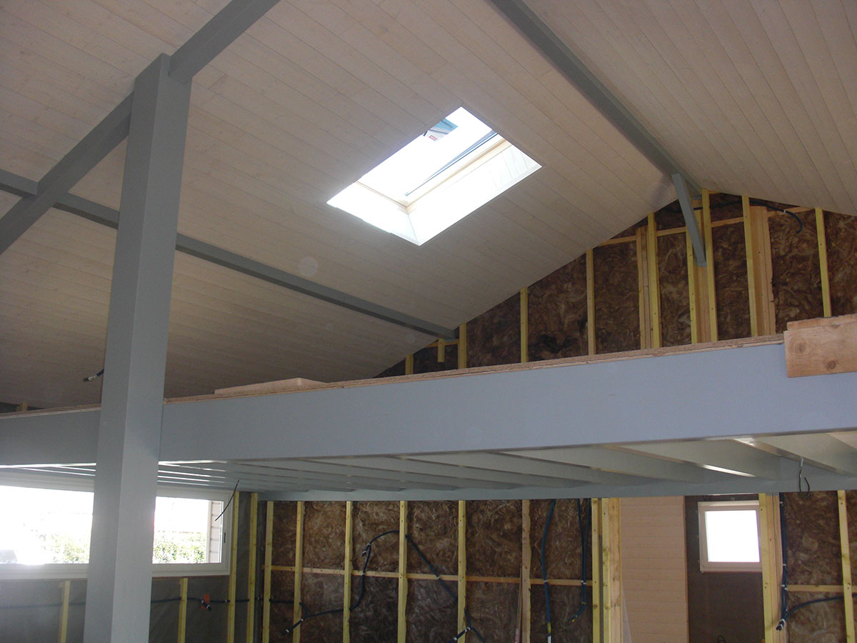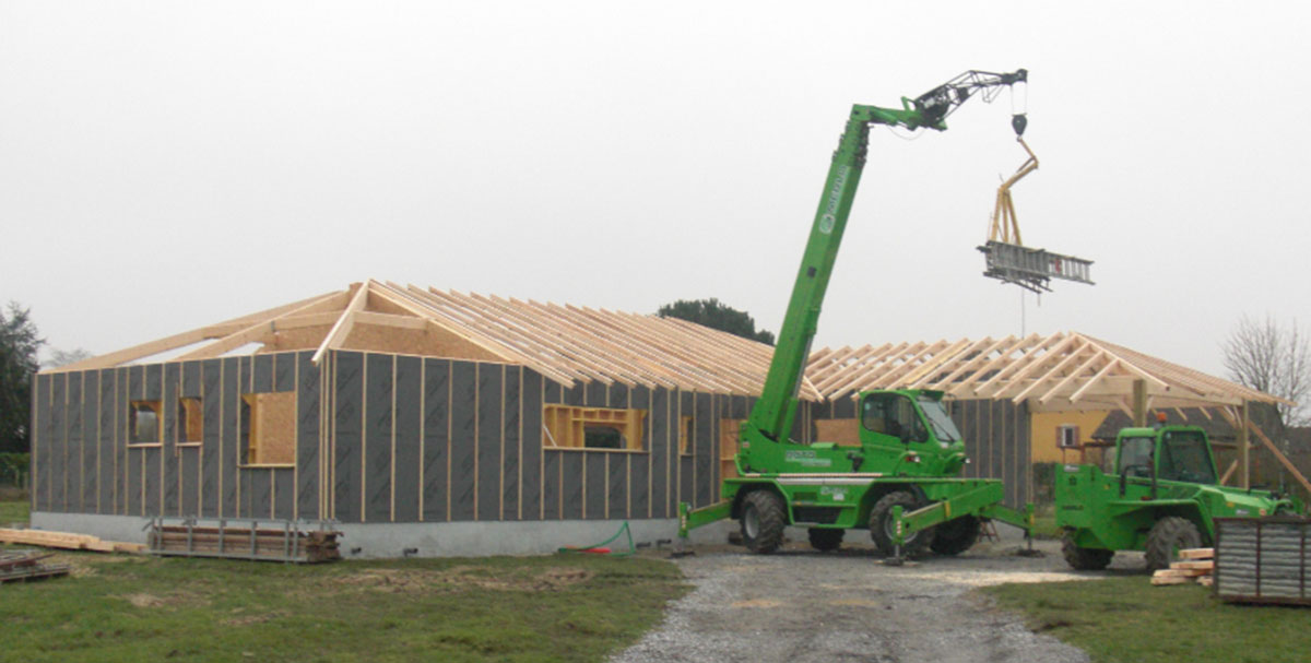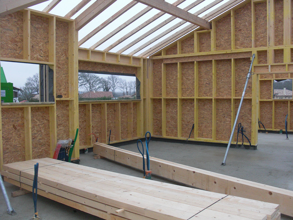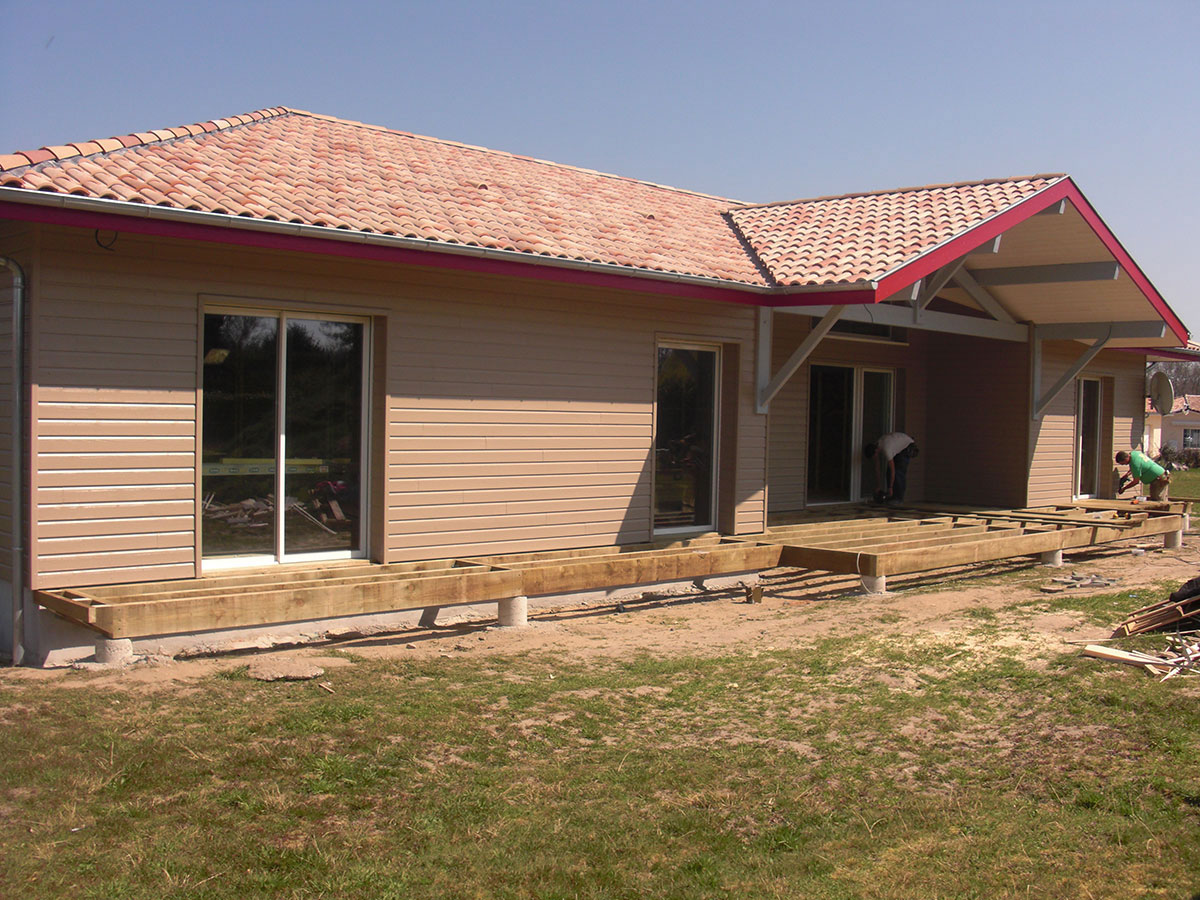 De plain-pied, cette maison en bois comprend deux espaces : 1 chambre+SDB d’un côté, 2 chambres+SDB de l’autre. À l’extérieur, un « carport » protège les véhicules.