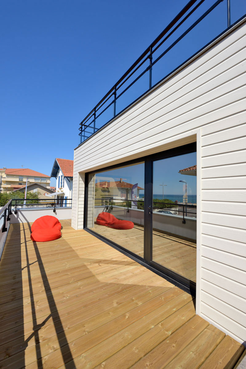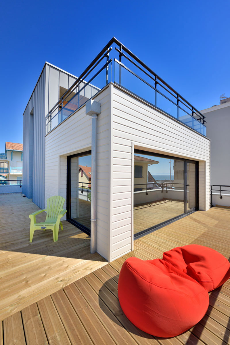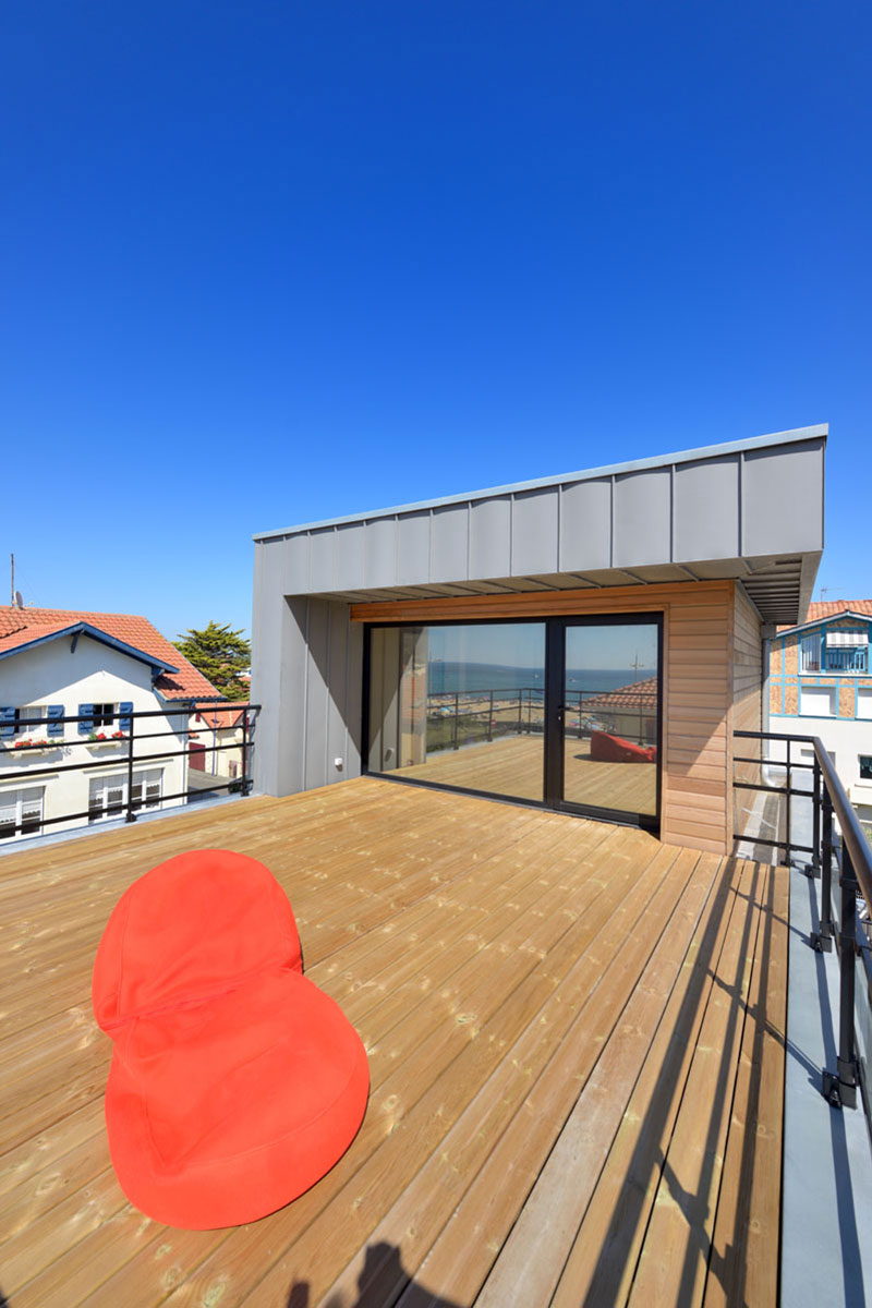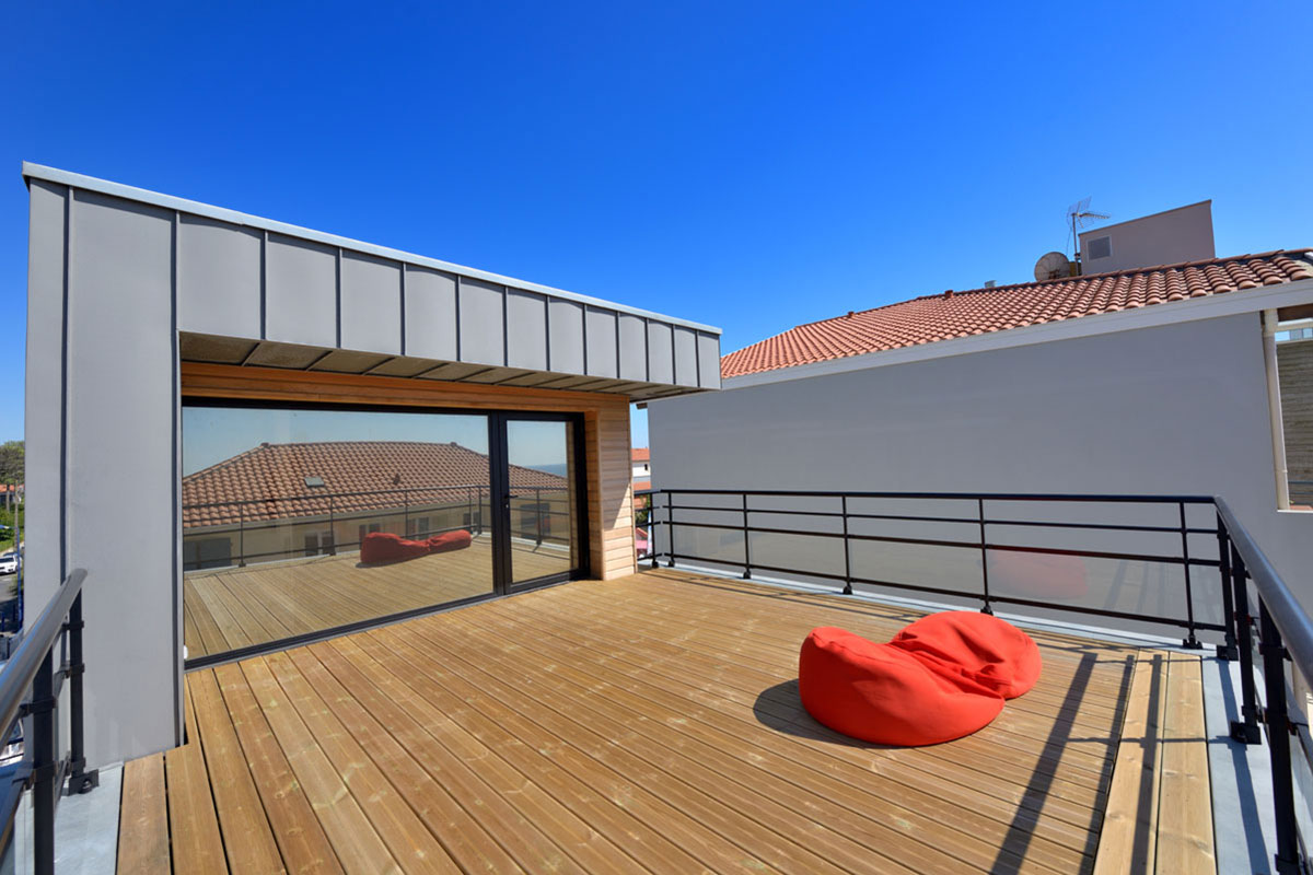 La surélévation de cette maison de ville à ossature bois a permis de réaliser également une magnifique terrasse en pin, pour profiter au maximum du soleil de la côte landaise.