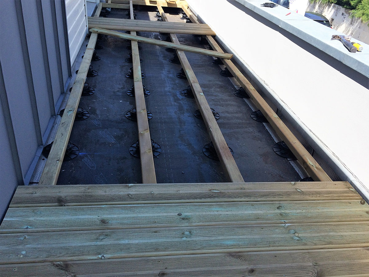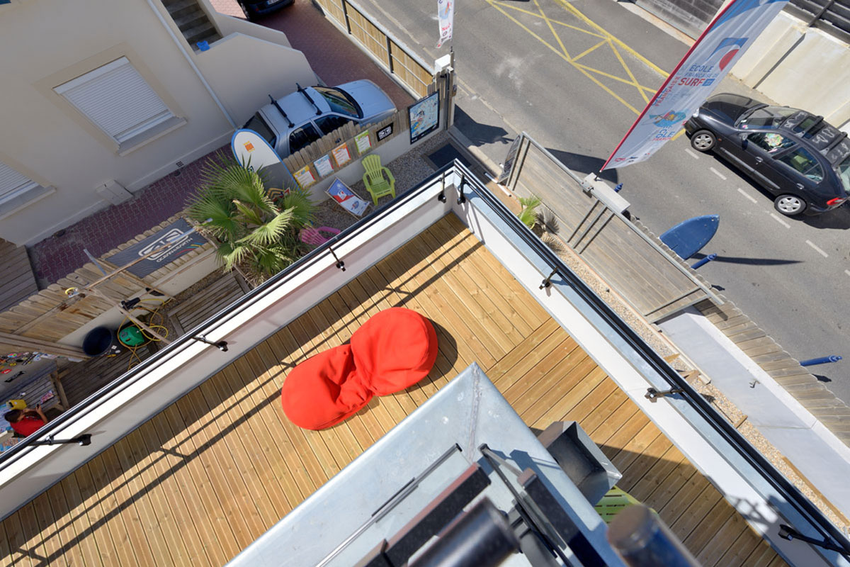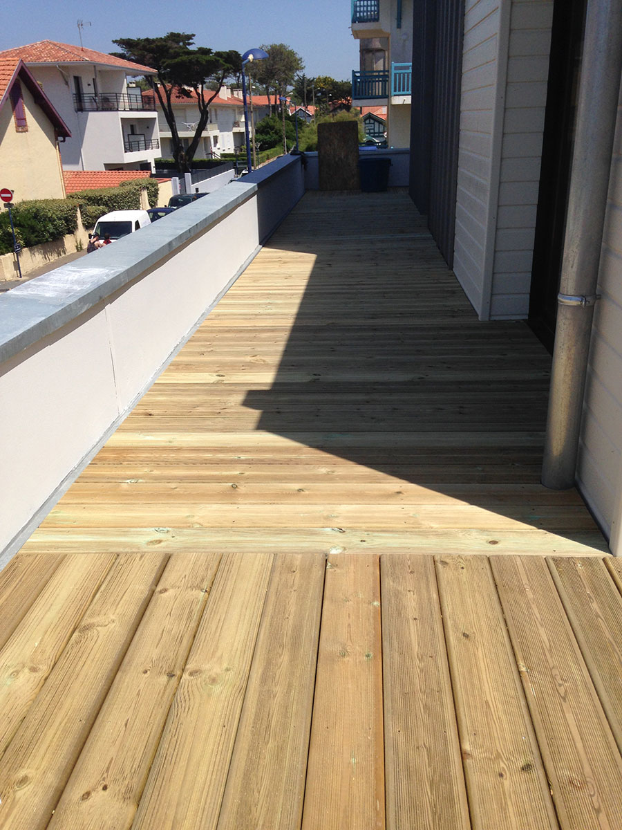 La surélévation de cette maison de ville à ossature bois a permis de réaliser également une magnifique terrasse en pin, pour profiter au maximum du soleil de la côte landaise.